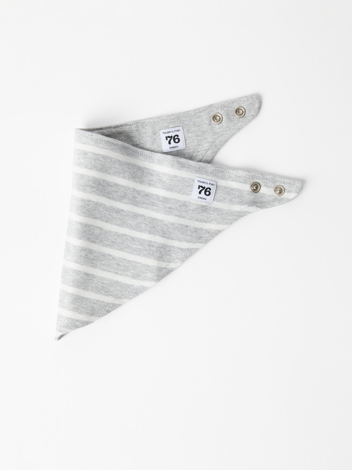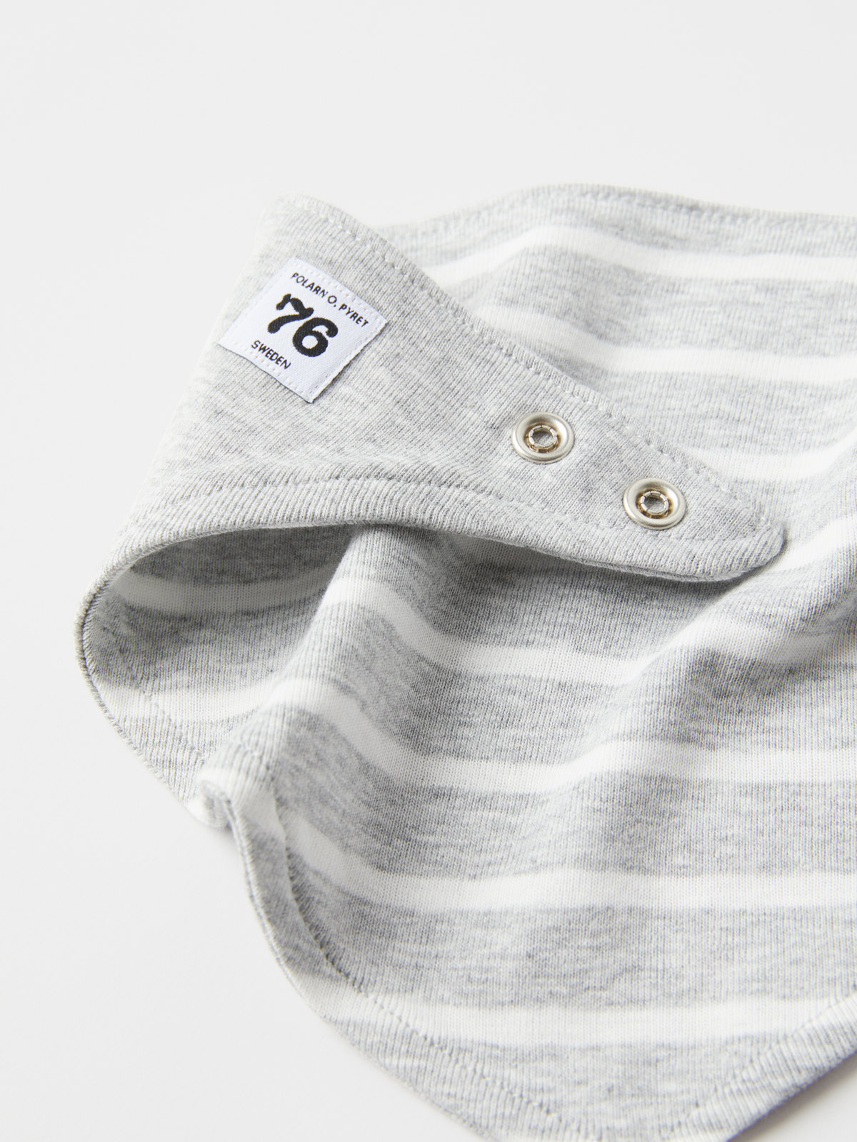 Vändbar dregellapp i mjuk trikå för baby. Dreggellappen skyddar kläderna och är tillverkad i 100% ekologisk bomull. Ena sidan har vår klassiska rand, och den andra sidan är enfärgad. Storleken i nacken kan regleras med tryckknappar.