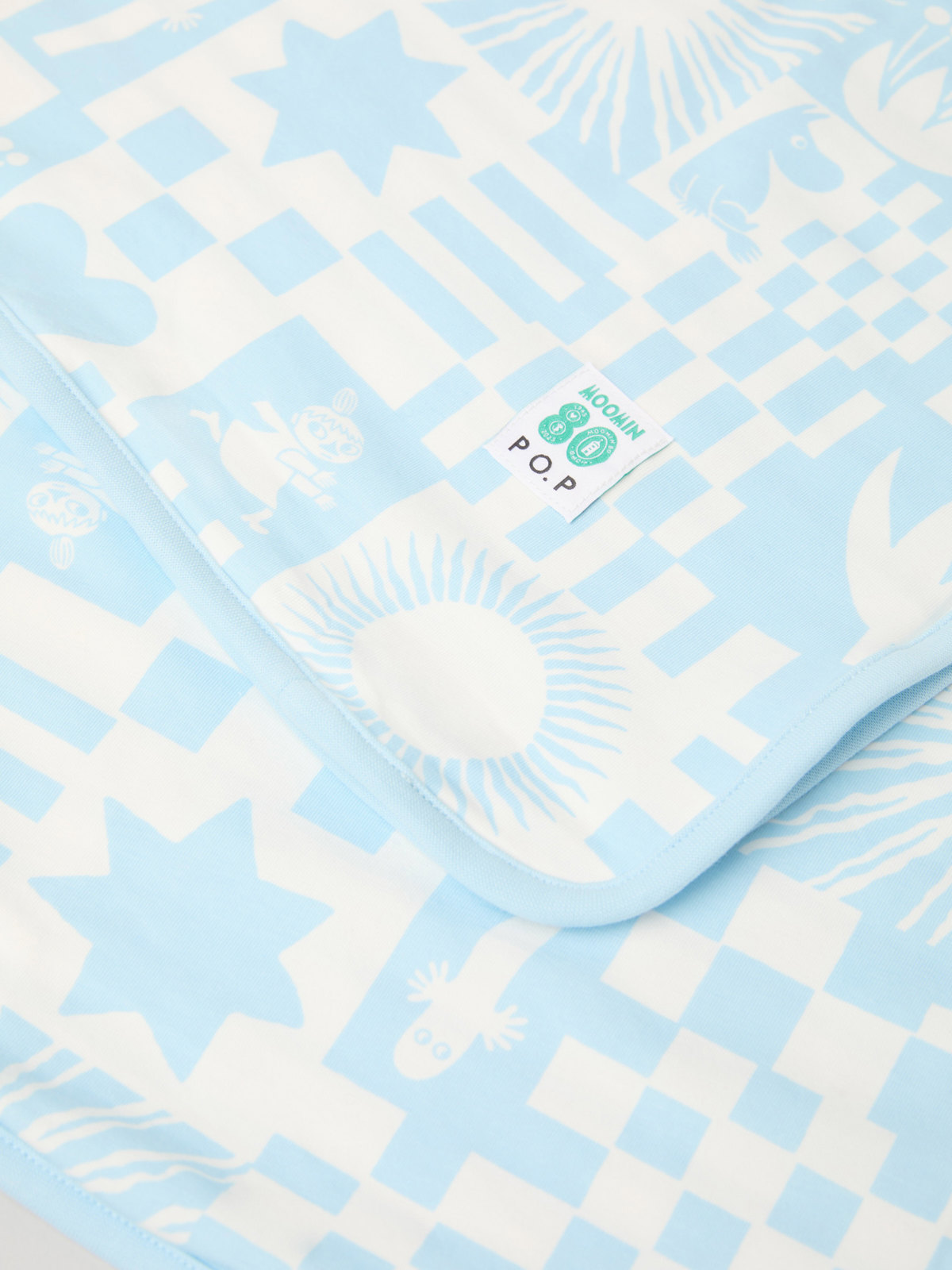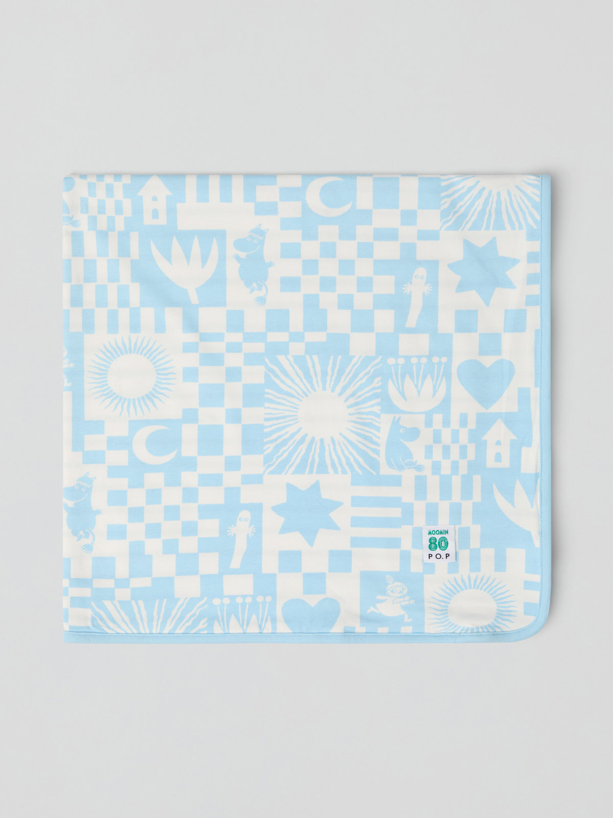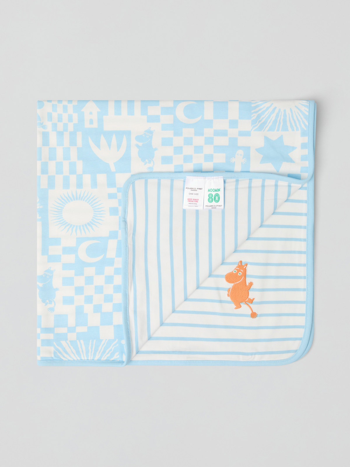 Mjuk och skön babyfilt i ekologisk bomull med illustrationer från Tove Janssons berättelser om mumintrollen. Perfekt att ha i vagnen eller hemma.