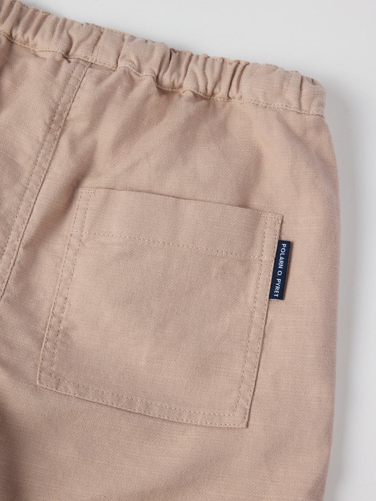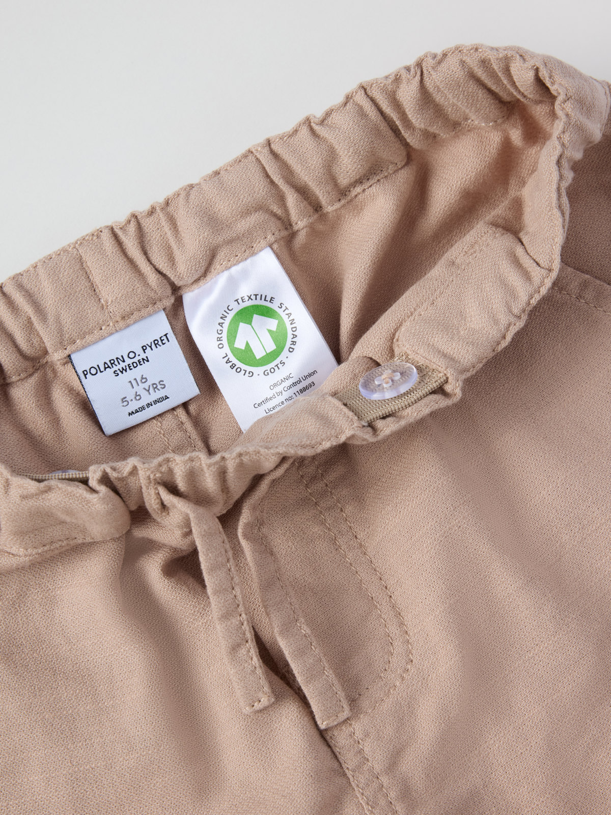Enfärgade shorts i tunn ekologisk bomull med linnekänsla – sköna både till vardag och fest. Shortsen har elastisk midja som går att justera med knytband, samt två fickor fram.