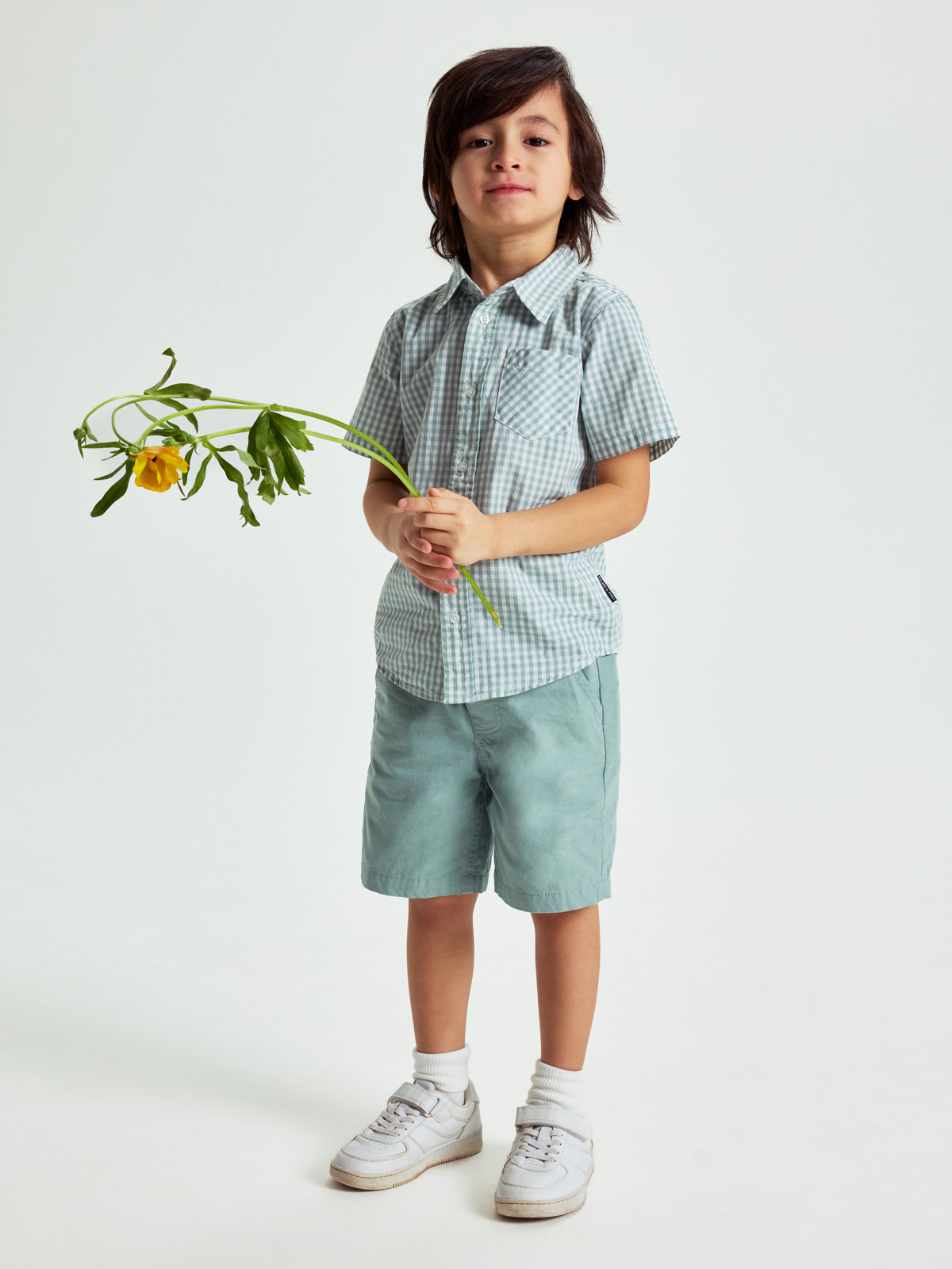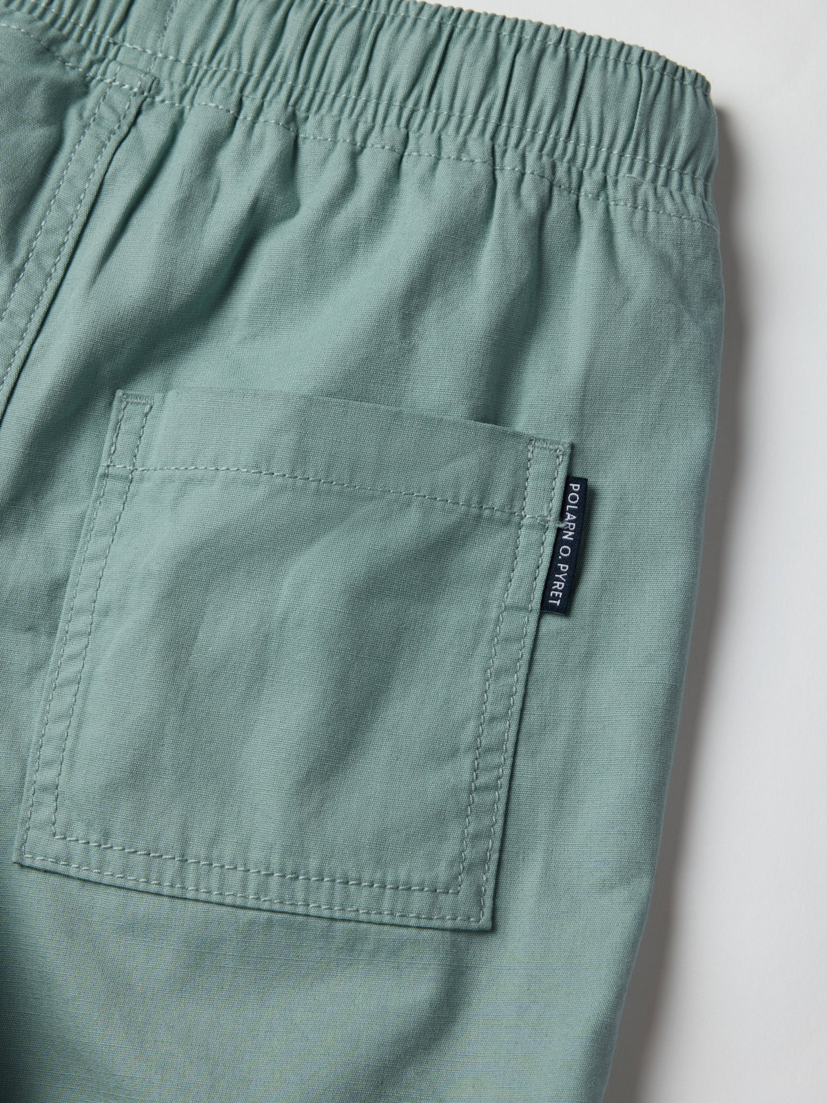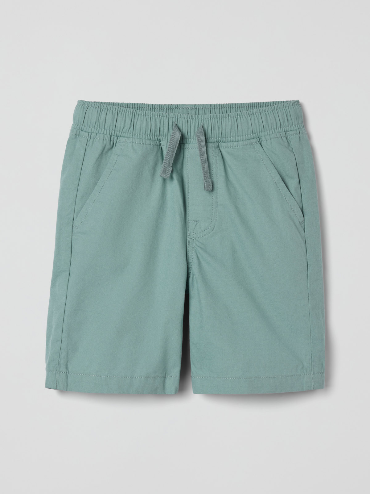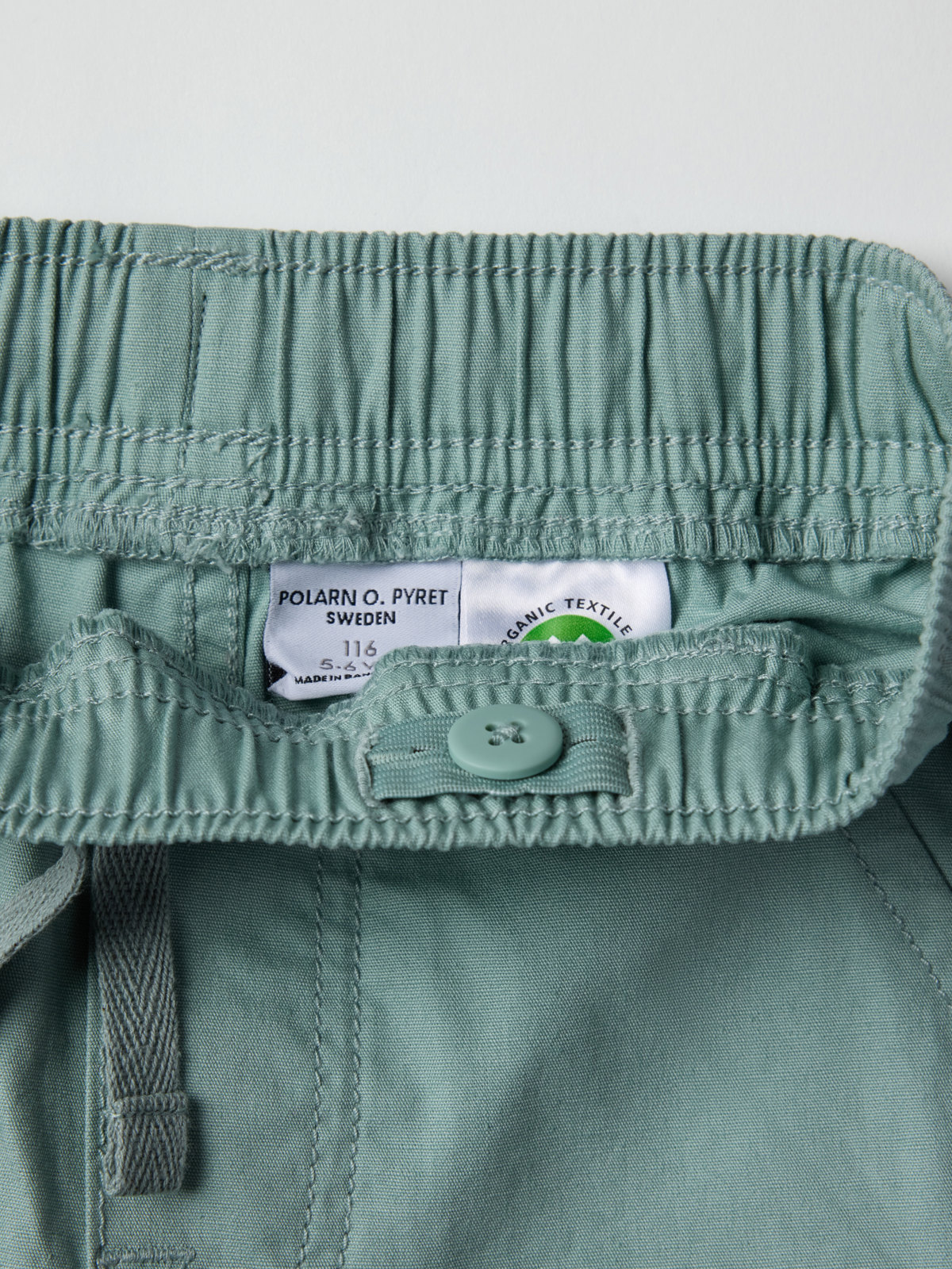 Enfärgade shorts i vävd ekologisk bomull – tunna och sköna både till vardag och fest. Shortsen har elastisk midja som går att justera med knytband, samt två fickor fram.