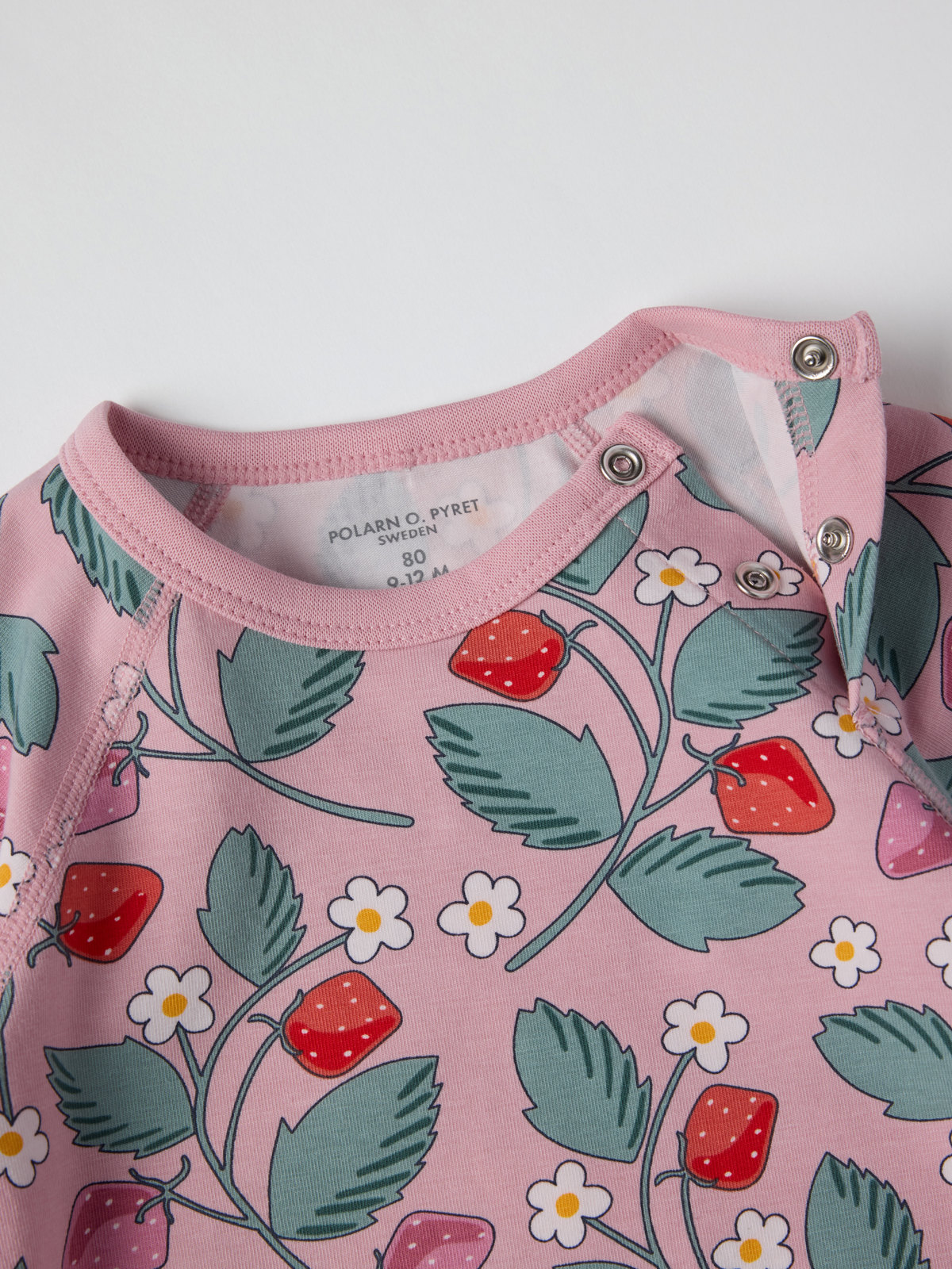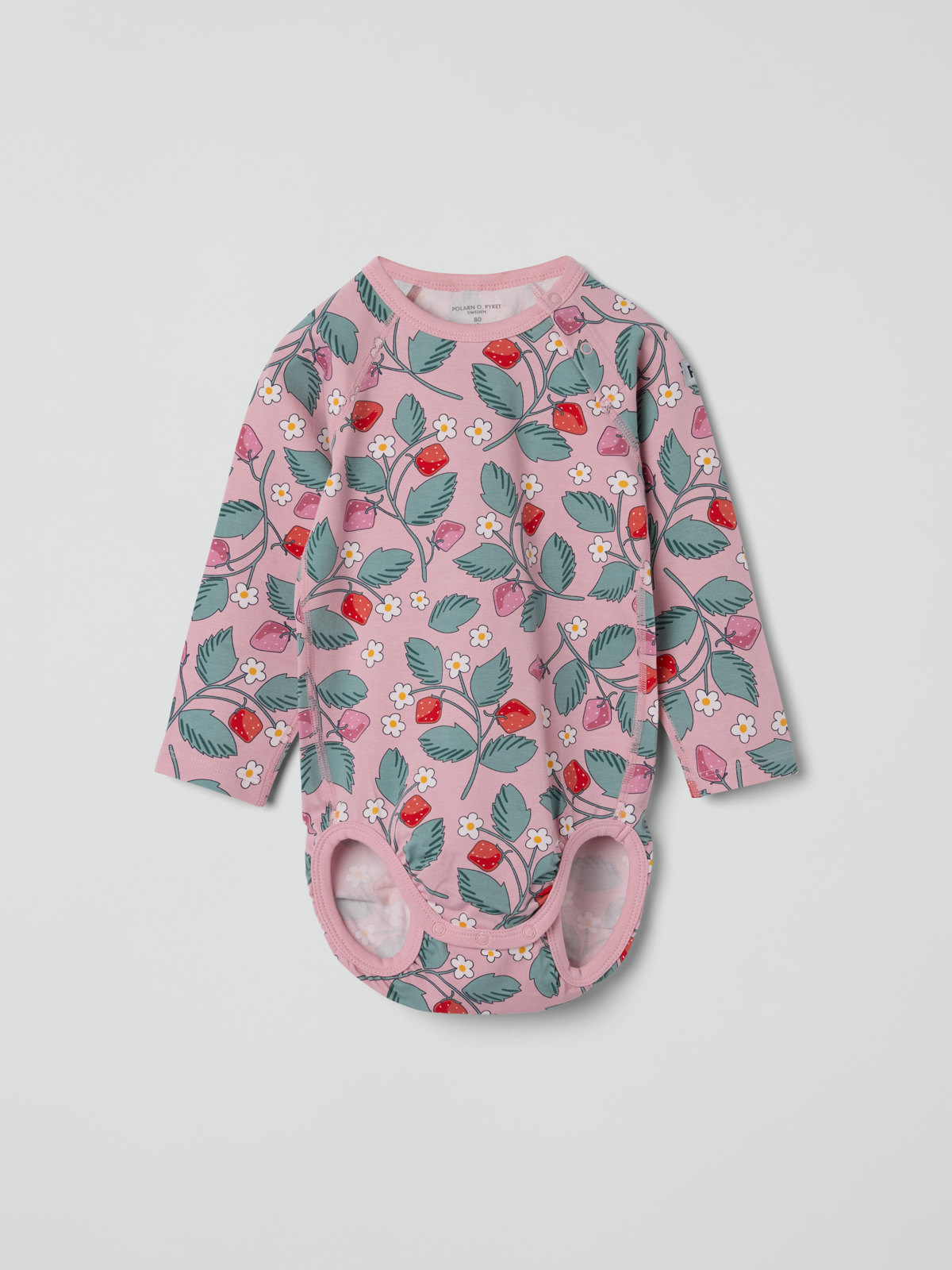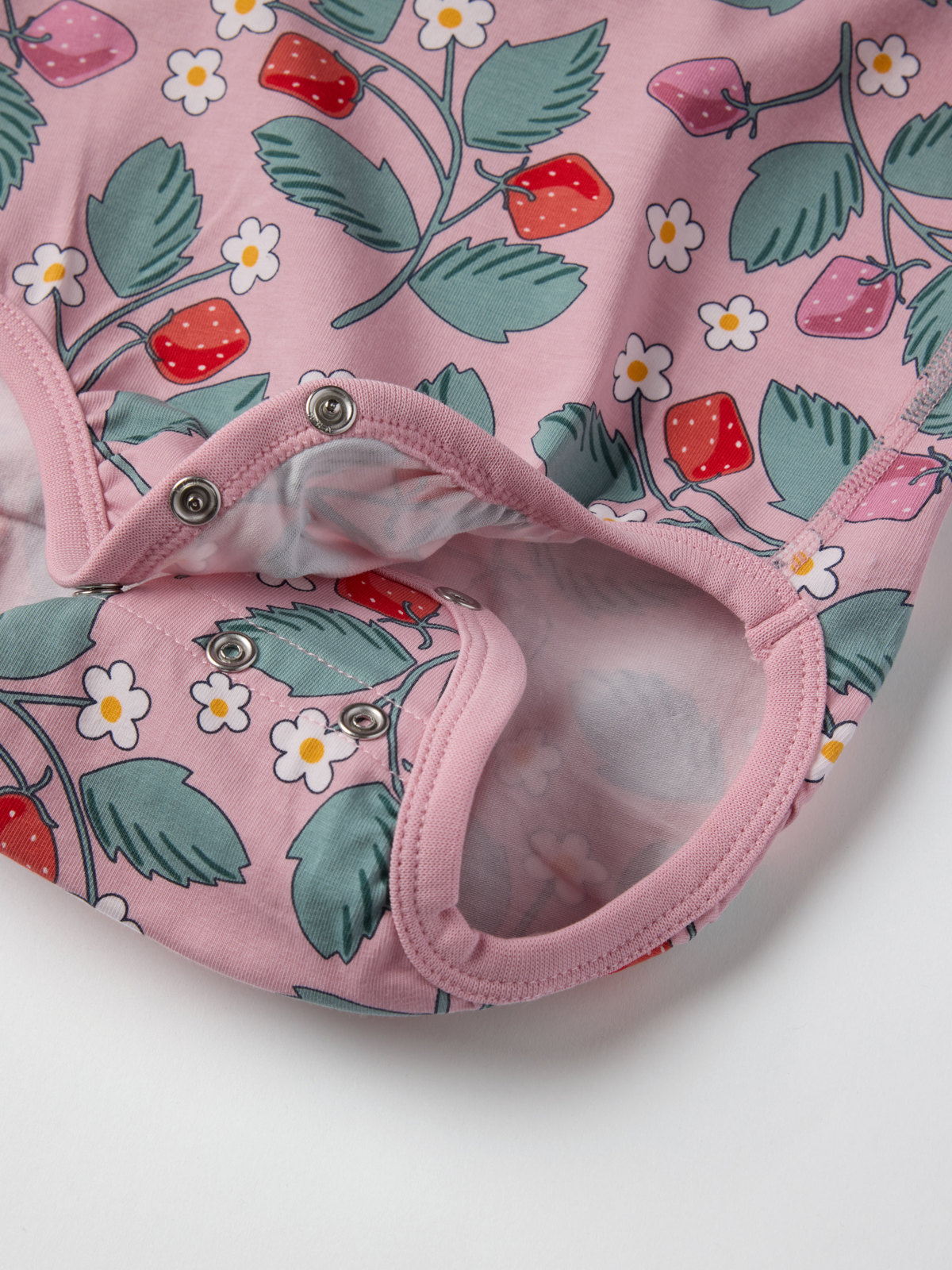 Body i 100 % mjuk ekologisk bomull, sydd med extra mjuka sömmar och skonsam mot känslig hud. Bodyn är helmönstrad med jordgubbar och matchar fint med hela kollektionen. Tryckknapparna på ena axeln och i grenen underlättar klädbyten.