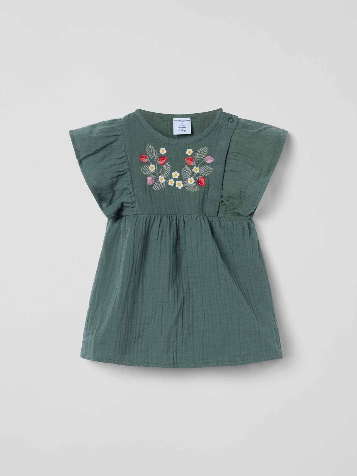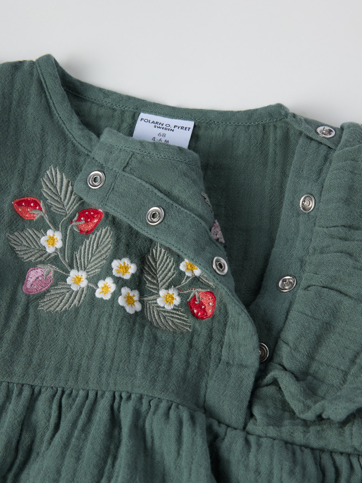 Söt klänning i mjuk muslin av 100 % ekologisk bomull för baby – en självklarhet på sommarens festligheter! Klänningen har mjuka volanger över axlarna och fin brodyr på bröstet. Tryckknapparna på ena axeln underlättar klädbyten.