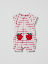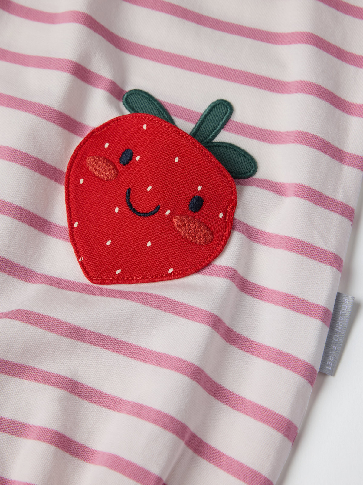 Randig playsuit i ekologisk bomullstrikå för baby med lekfulla fickor i form av jordgubbar – en mjuk och festfin sommarfavorit! Playsuiten har luftig design och korta fjärilsärmar med vågigt ärmslut, samt elastisk halsringning och benslut.