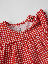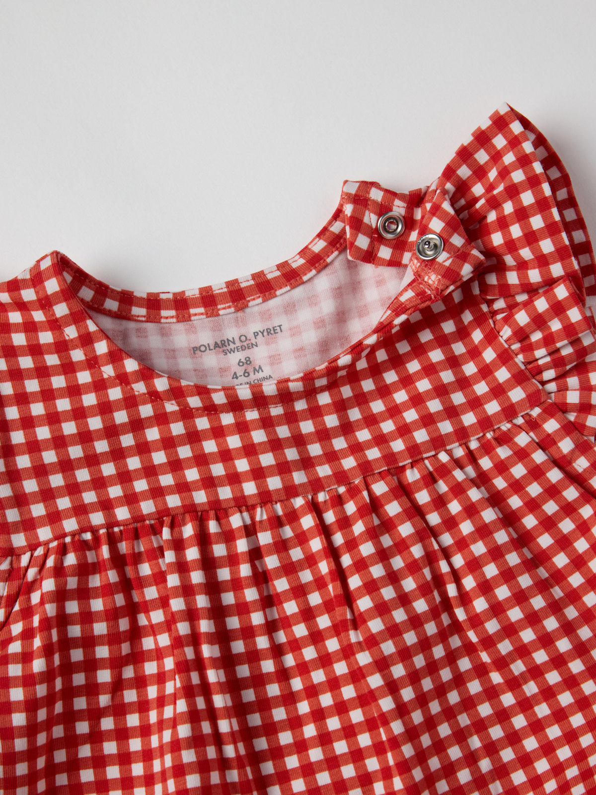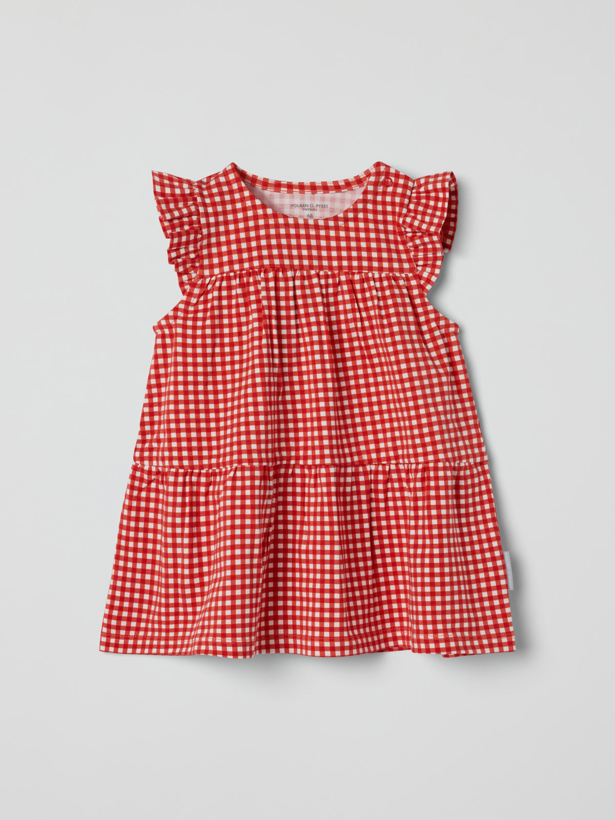 Rutig ärmlös klänning i mjuk ekologisk bomullstrikå – en fin och skön sommarfavorit! Klänningen har små volanger över axlarna, vid passform och stängs med knappar på ena axeln.