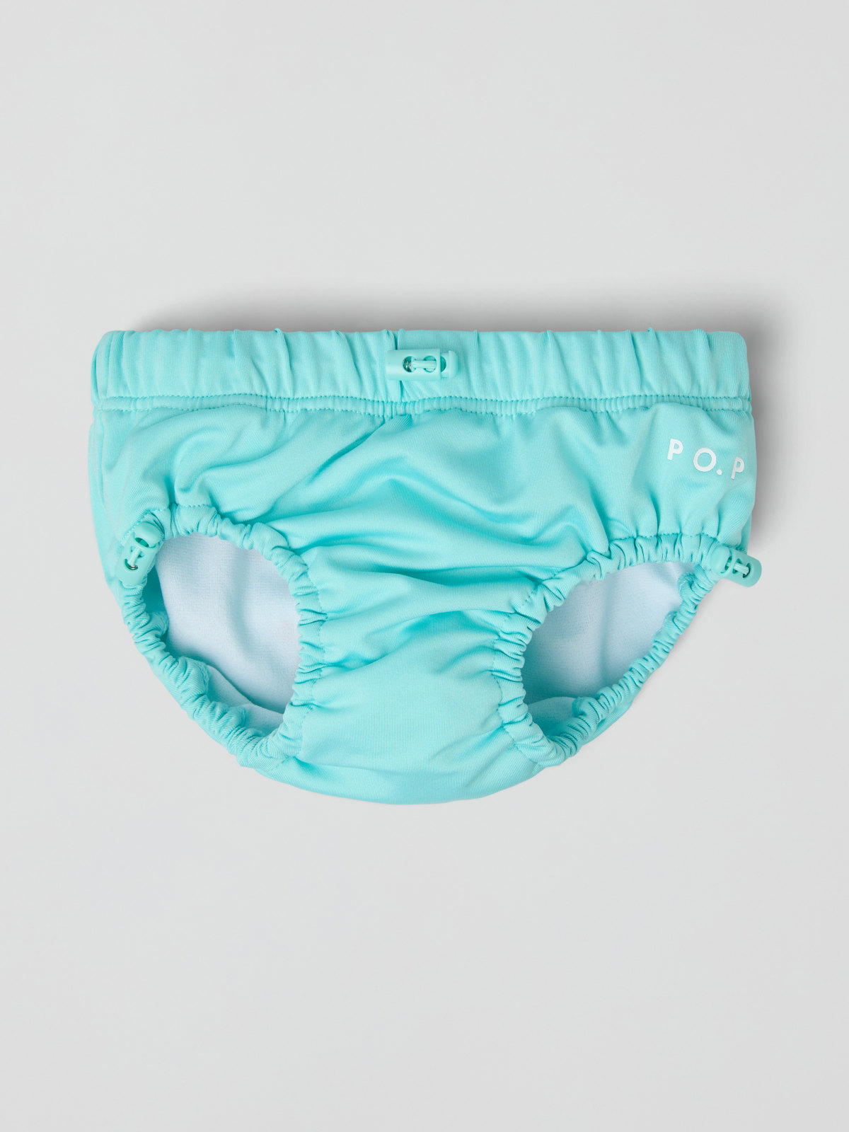 Badblöja i återvunnet material – perfekt för babysim eller badutflykten! Badblöjan har ett sött björnansikte på bakstycket och ett extra foder som fångar upp små olyckor. Runt benöppningarna finns justerbar resår. Midjan är elastisk och går att reglera på insidan med knytband.