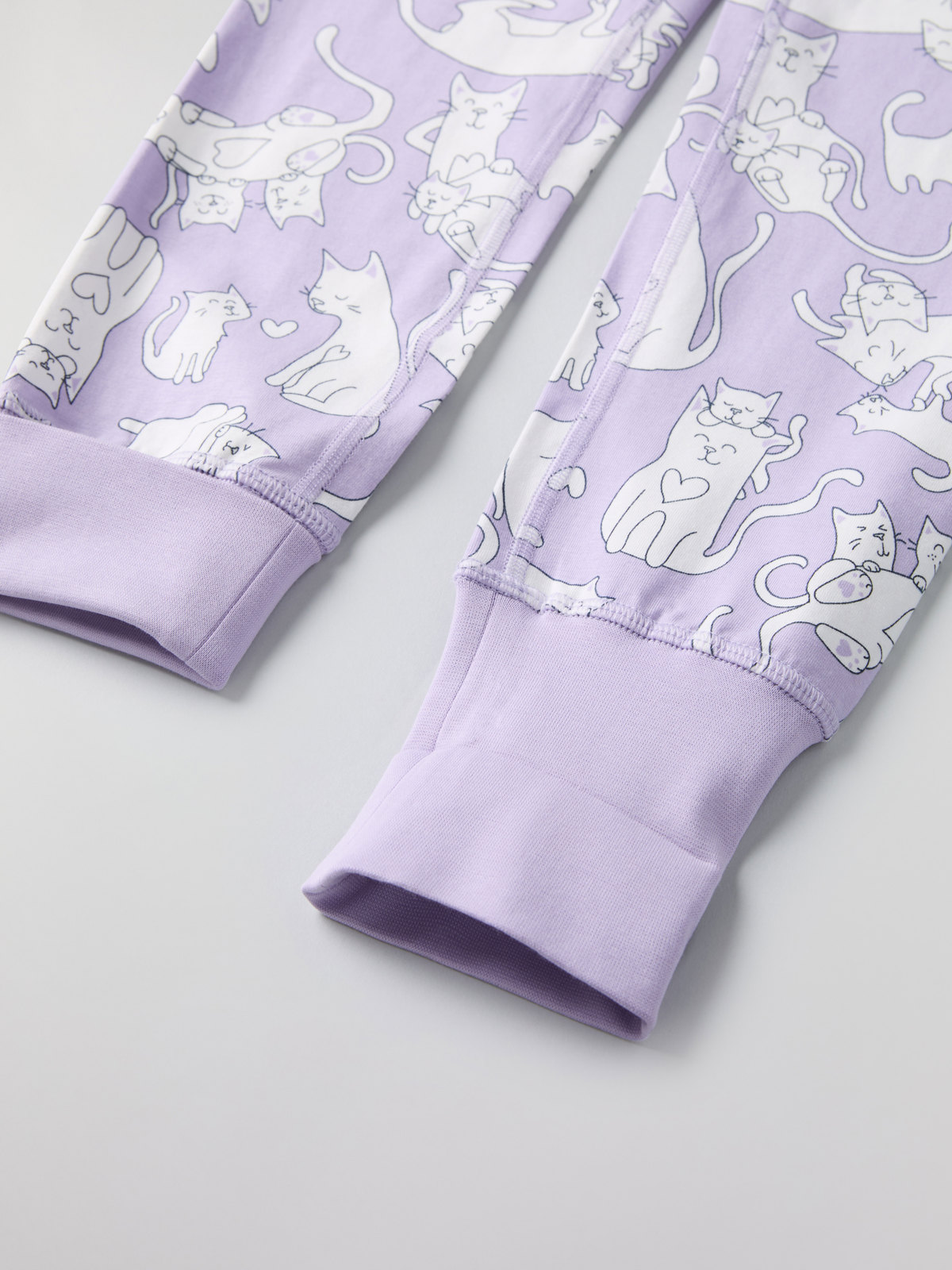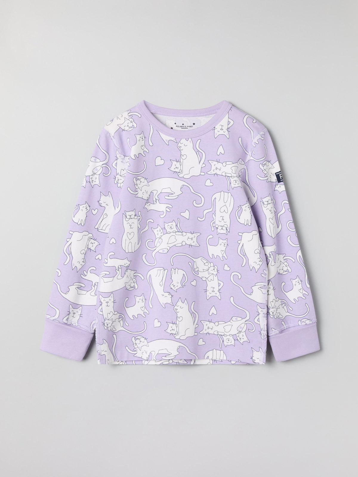 Tvådelad pyjamas i mjuk, ekologisk bomull helmönstrad med katter. Tröjan har extra lång mudd vid ärmslut som går att vika upp eller ned. Byxan har elastisk midja och extra lång mudd vid benslut.