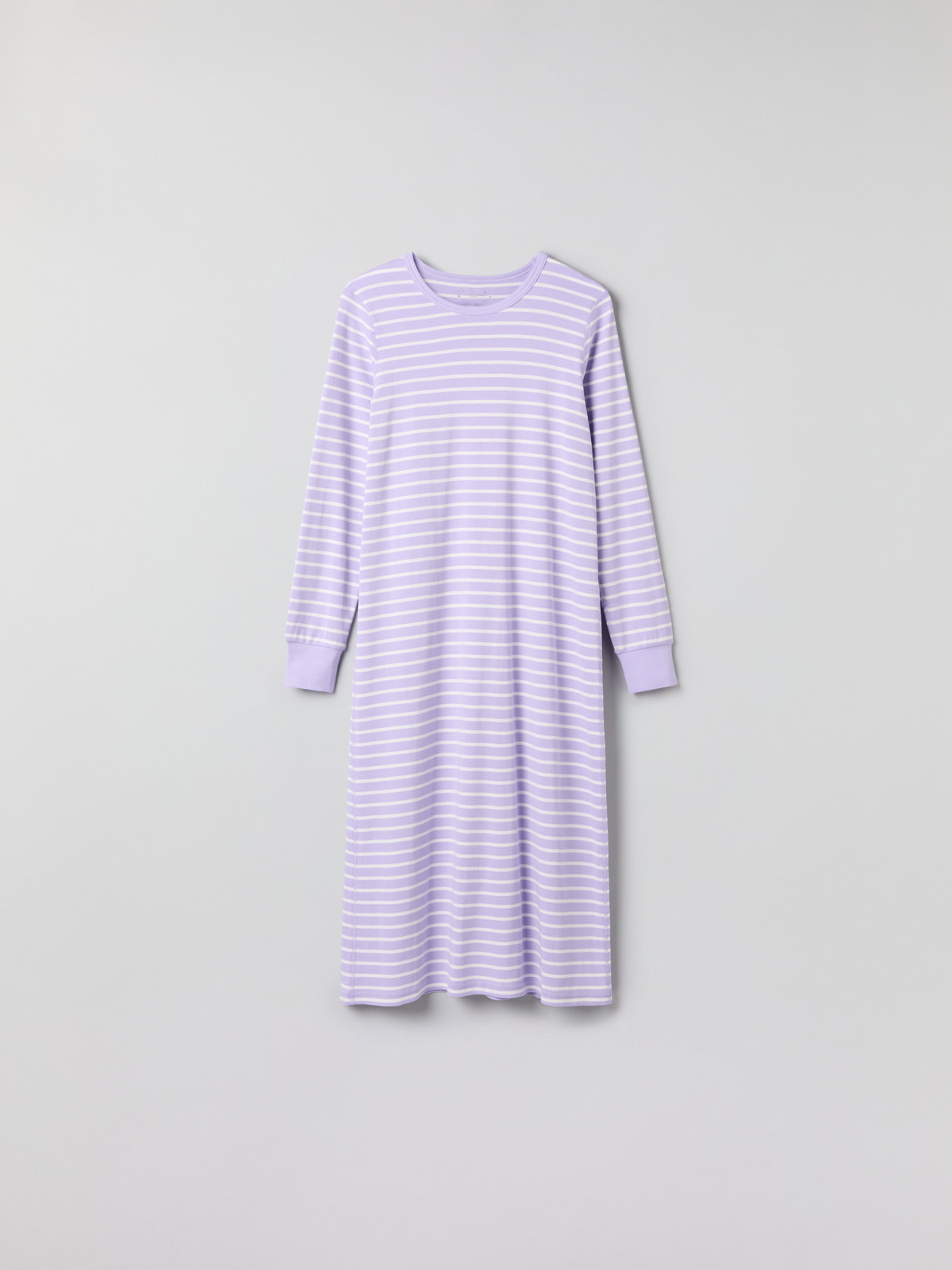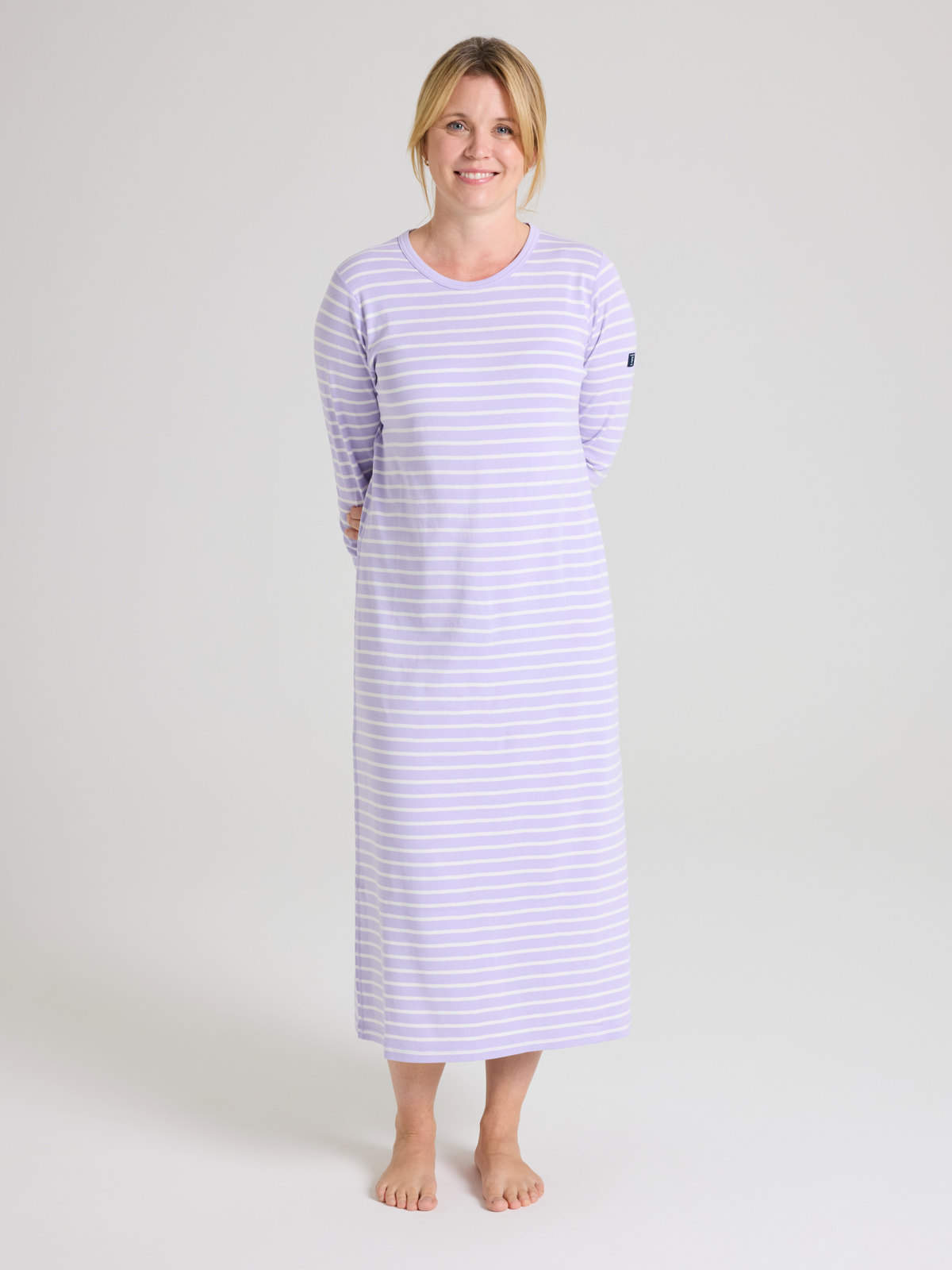 Randigt nattlinne i 100 % mjuk ekologisk bomull för vuxen – en klassiker att älska länge. Nattlinnet har mjuka muddar vid ärmsluten för skön passform.