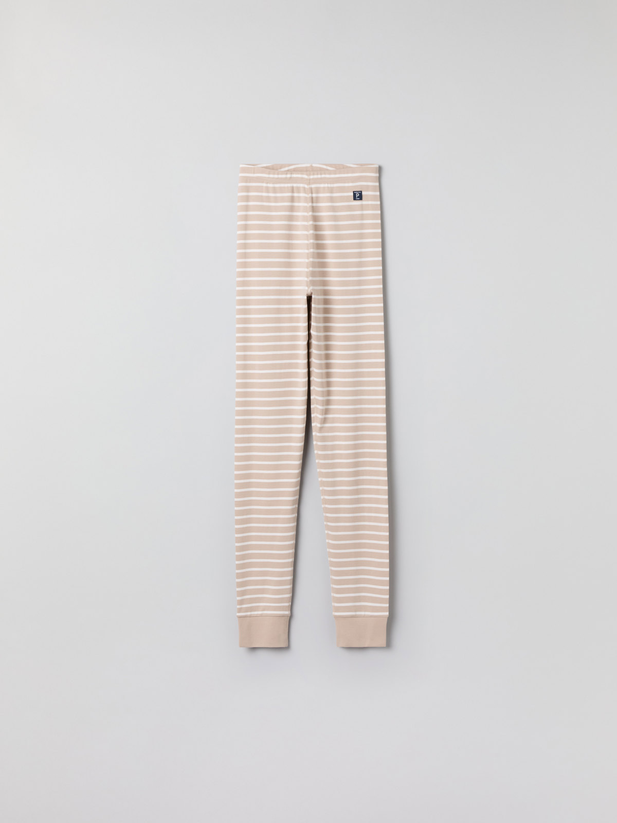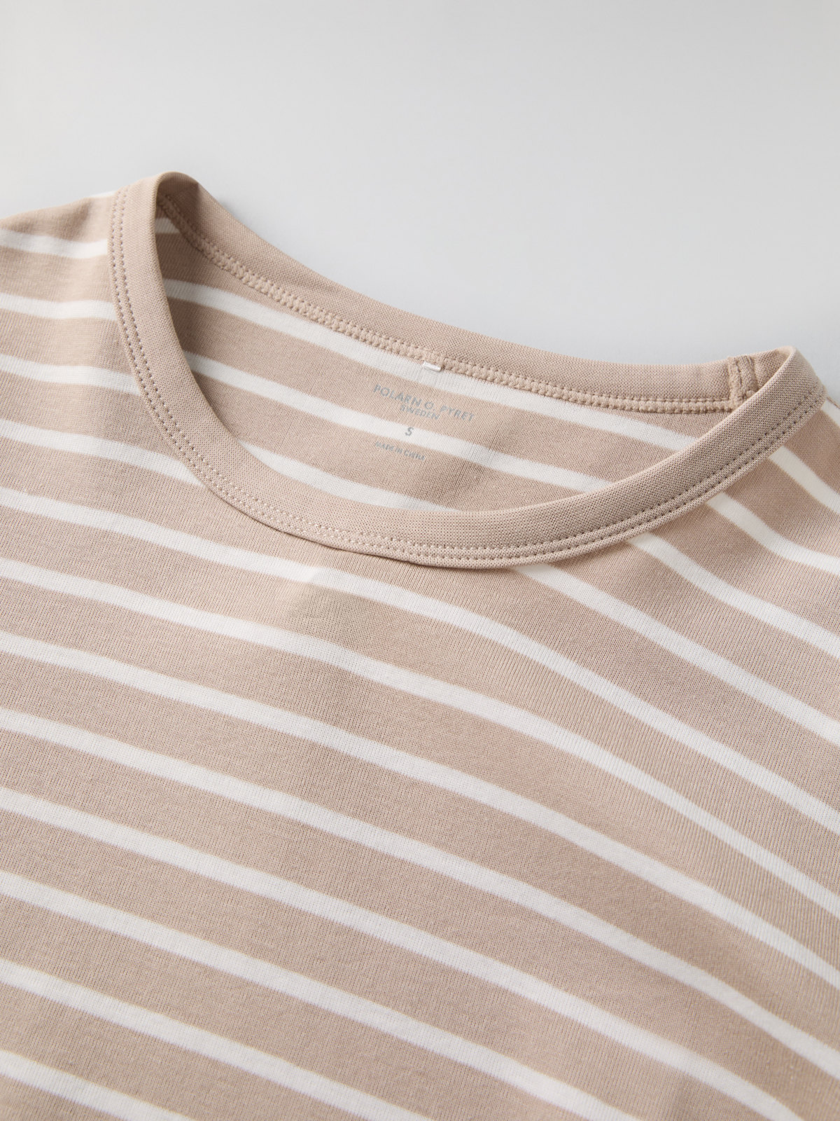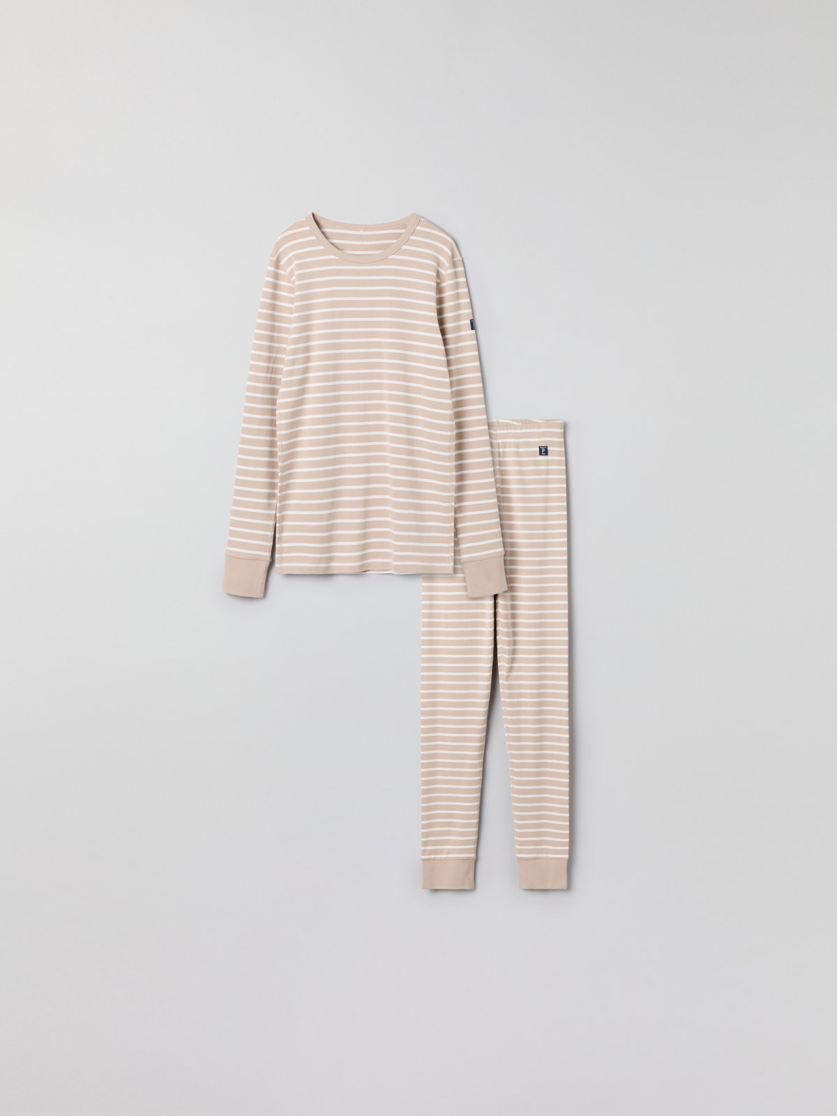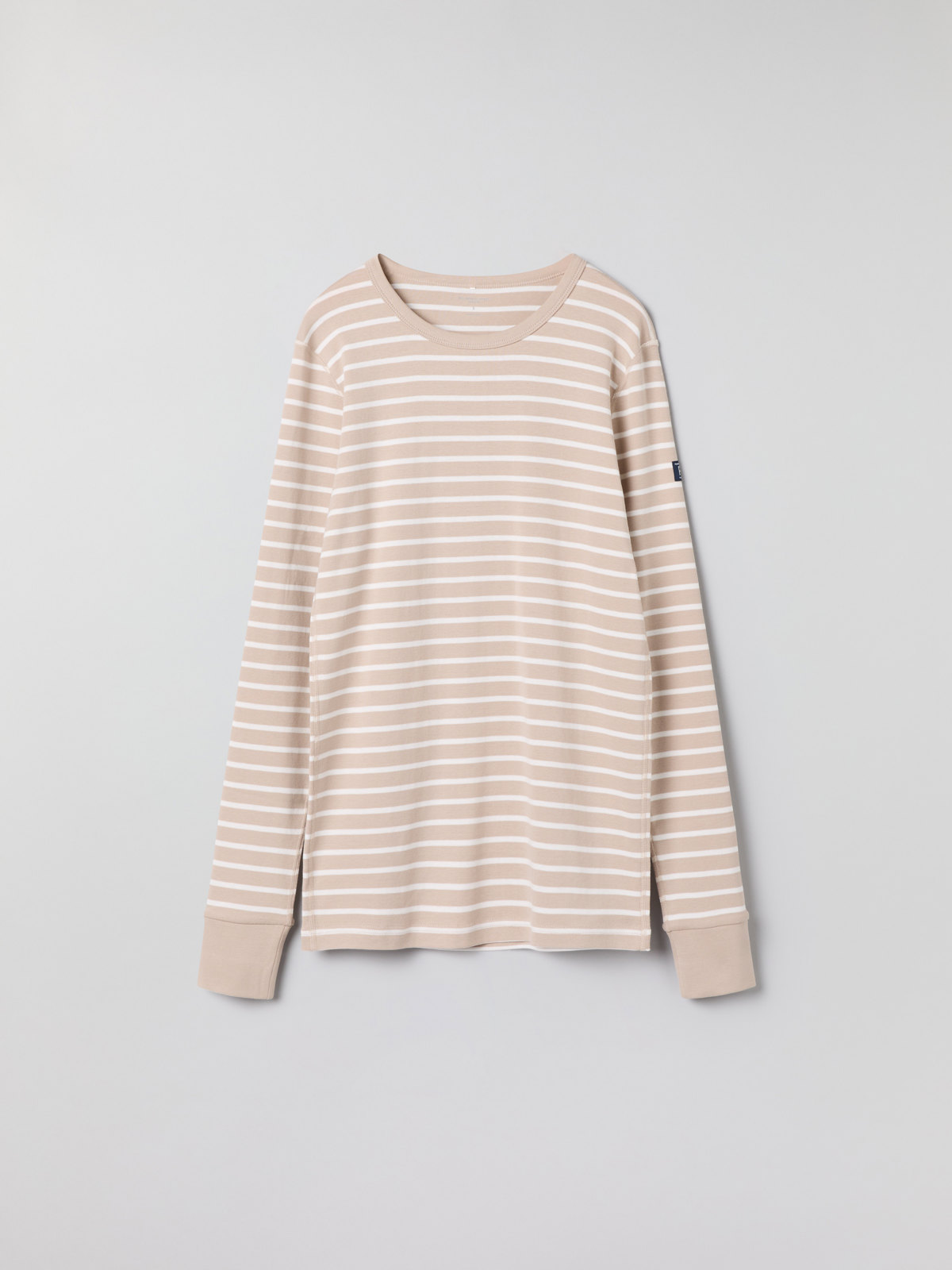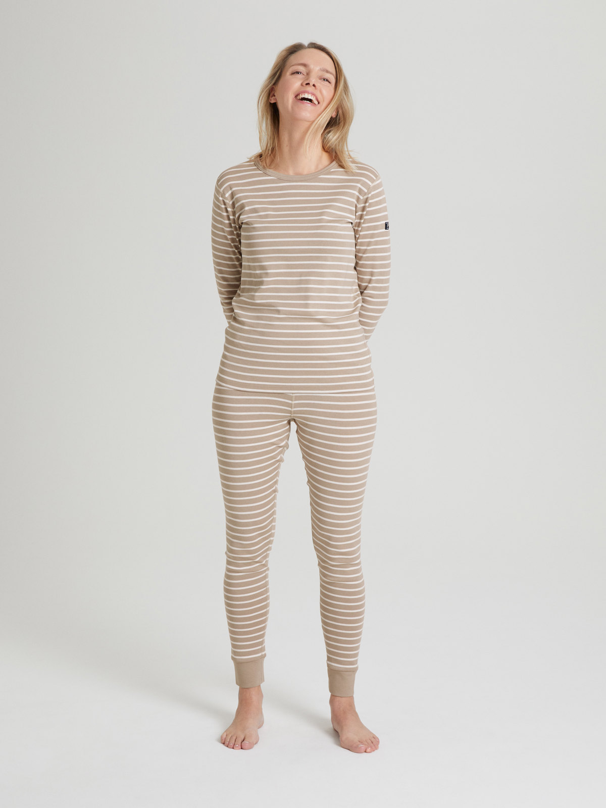 Ett set med tröja och byxa i vår klassiska rand, i vuxenstorlekar. Tröjan har mjuk ribbad mudd kring halsringningen och vid ärmsluten. Byxan har elastisk midja och mjuk ribbad mudd vid bensluten. Storlekarna i våra vuxenkläder går enligt standard, så välj den storlek du brukar köpa.