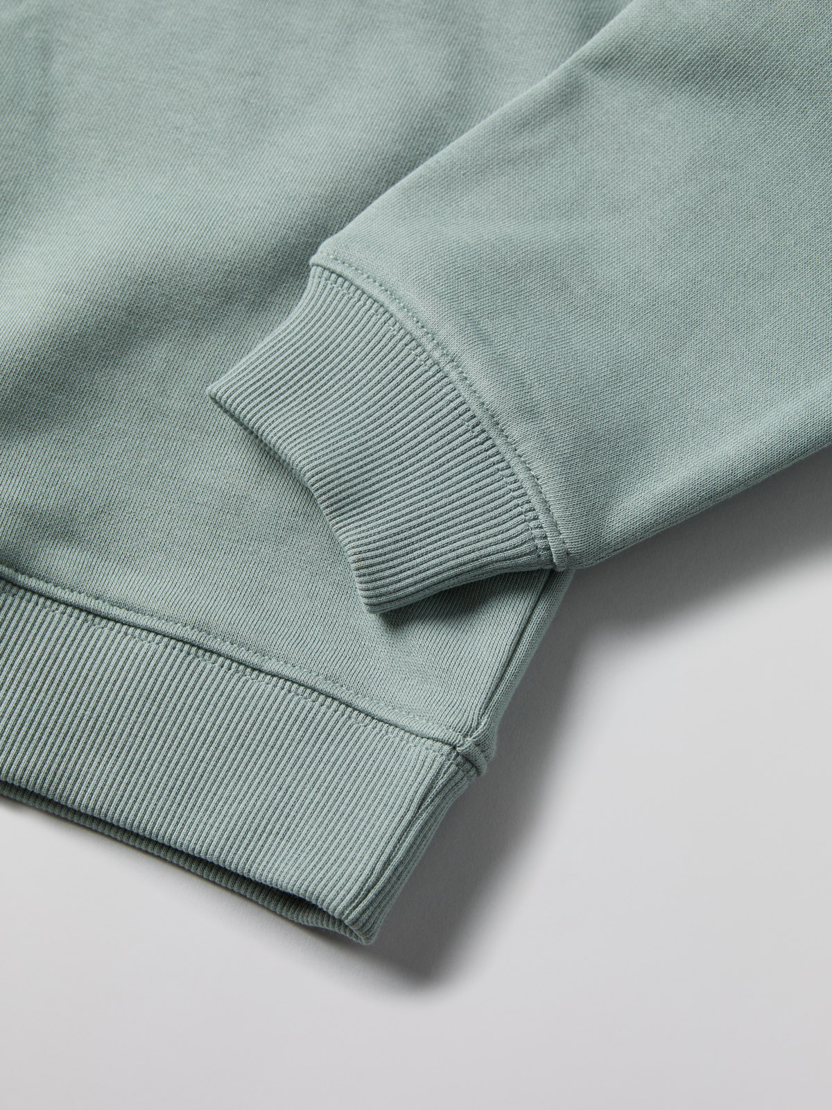 Tröjan har mjuka ribbad mudd i halsringning och ärmslut.