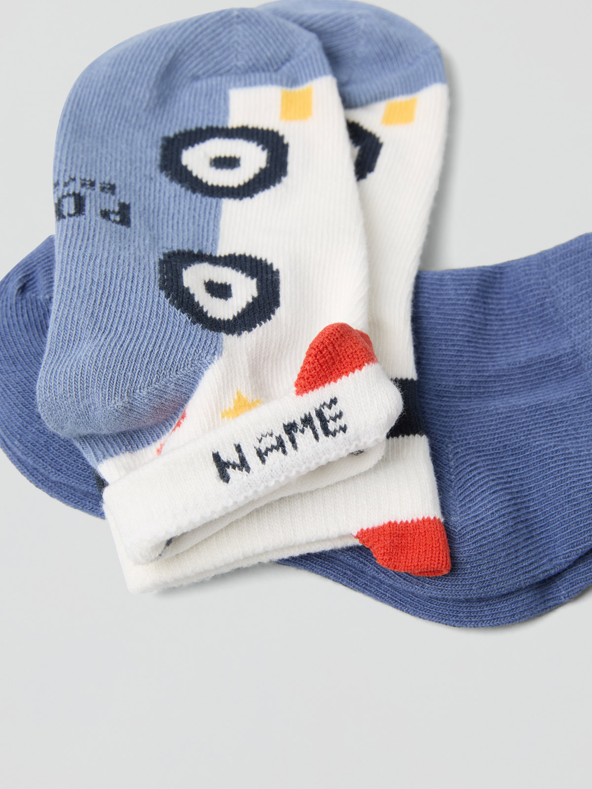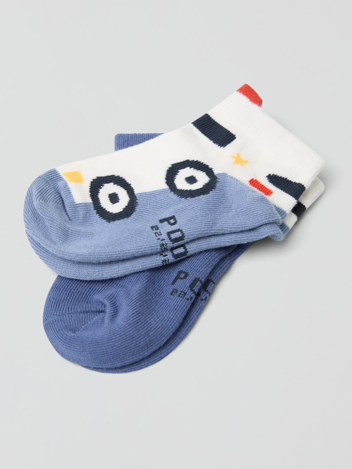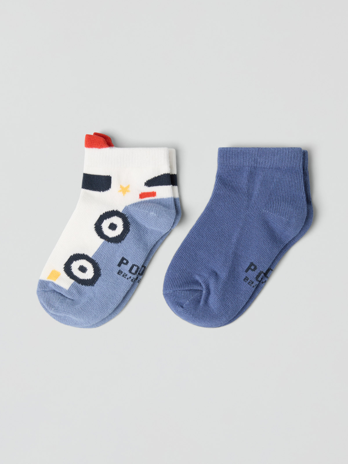 2-pack ankelstrumpor i mjuk ekologisk bomull – riktigt sköna sommarfavoriter! Det ena paret är mönstrat som en bil, det andra är enfärgat.
