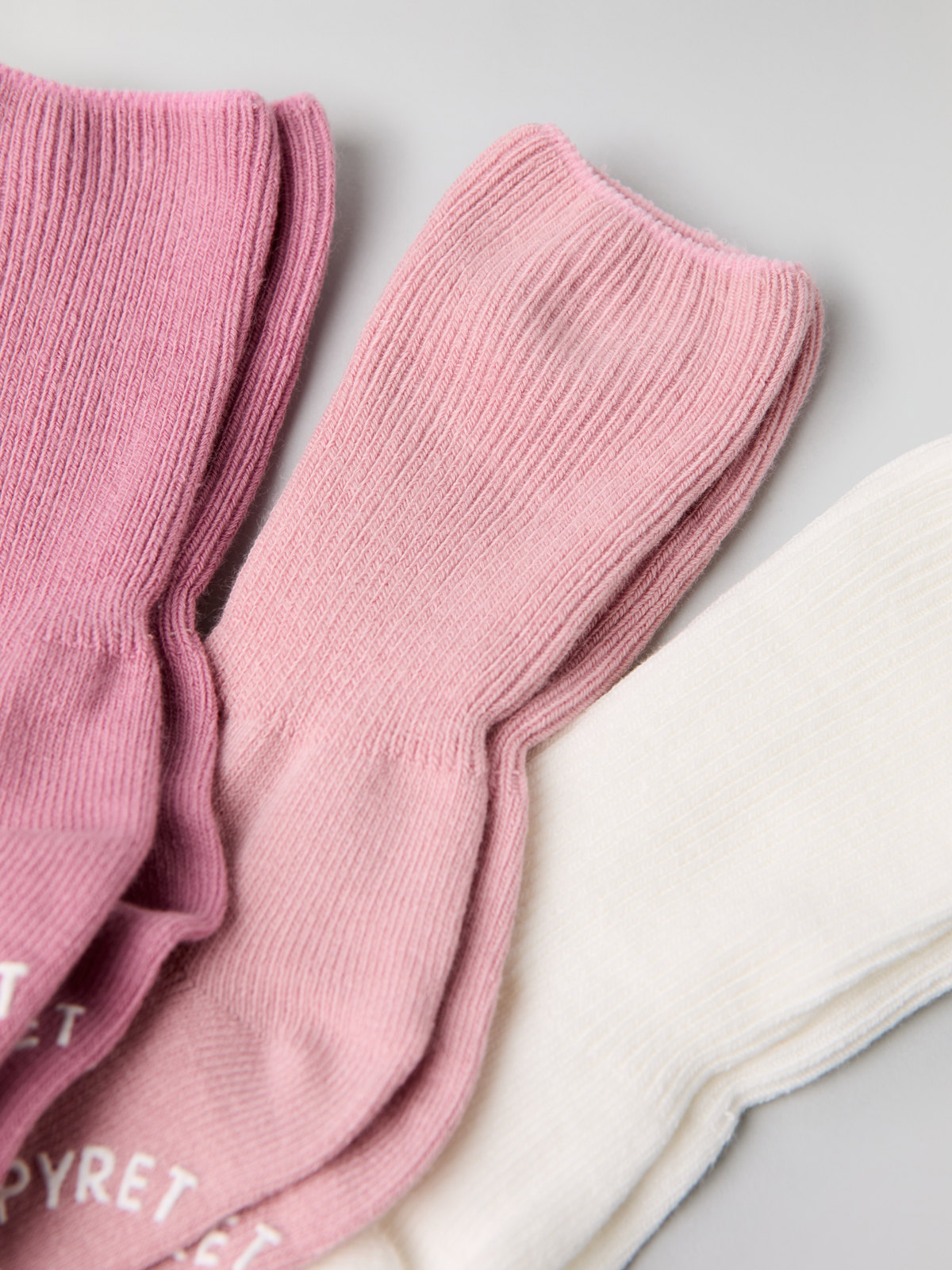 Fyll på strumplådan med två par enfärgade strumpor, i mjuk ekologisk bomull för baby. Strumporna har mjuk, vikbar mudd som inte skaver.