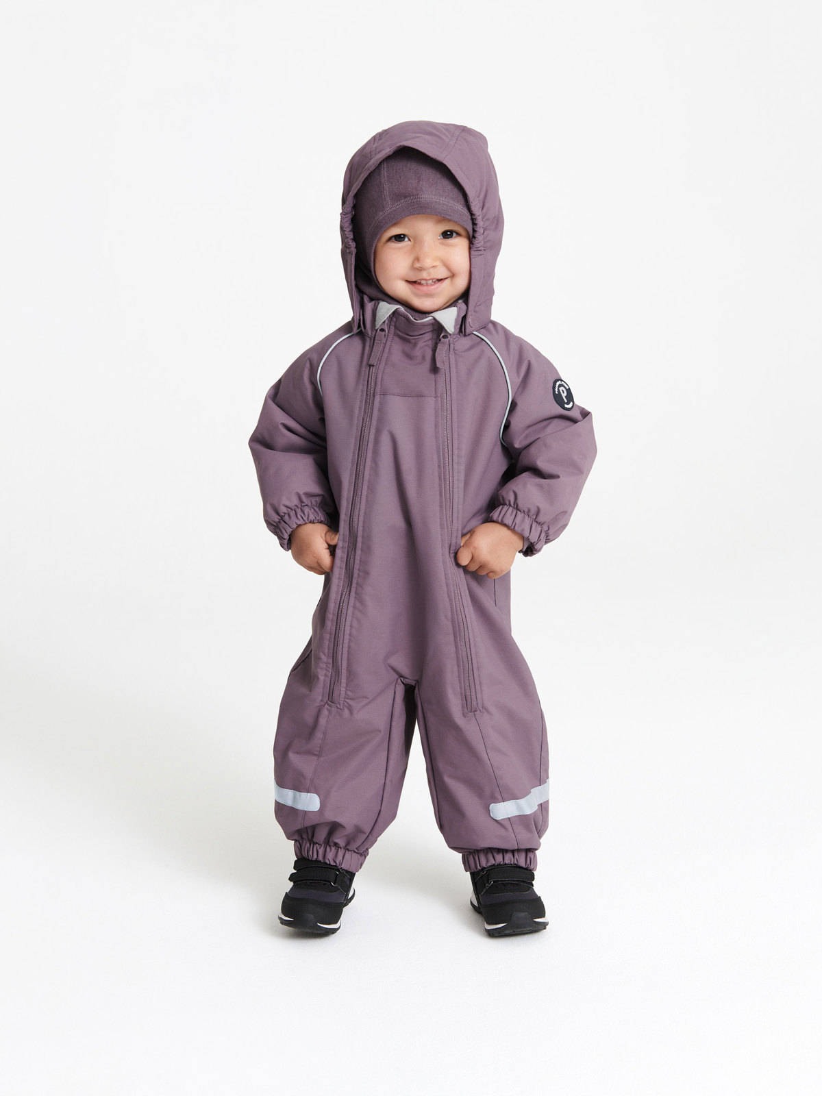 Den har ett avtagbart foder, i varm och skön fleece som gör att den både kan användas under vår/höst och vid mildare vinterväder. Med hjälp av en kontrastfärgad startknapp som finns på insidan, kan du enkelt knäppa ihop fleecefodret med overallen. Den reglerbara huvan är avtagbar och går att fästas med tryckknappar. På insidan av kragen och ärmsluten finns ett mjukt fleecefoder. Och vindslån på insidan av dragkedjorna skyddar ytterligare mot kall luft. Både overallens midja, ärm- och benslut är elastiska för skön passform. De utbytbara elastiska fothällorna håller bensluten på plats.