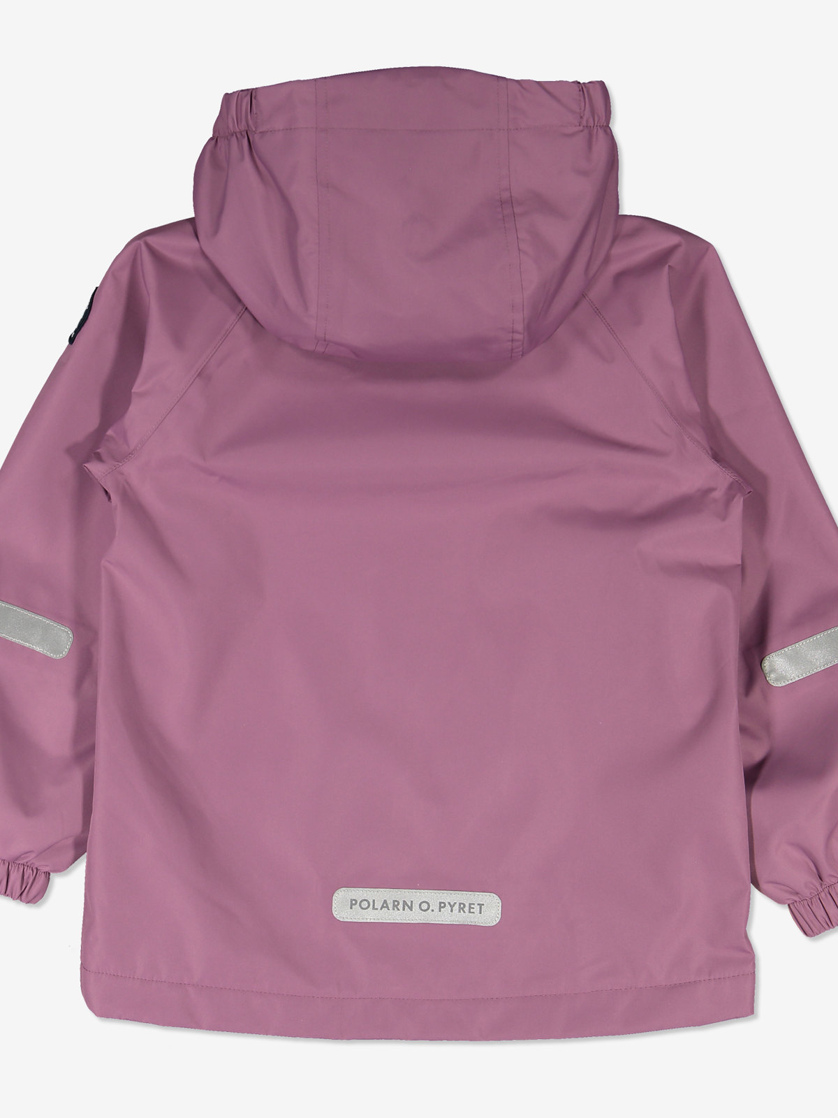 Jackan är av slitstarkt material och har dessutom god andningsförmåga. Den har ett enfärgat fleecefoder i 100% återvunnen polyester, och avtagbar huva som går att fästas med tryckknappar, huvan har dessutom elastik i sidorna. Jackan har elastiska ärmslut och heltejpade sömmar som gör den helt vattentät. Vindslån på insidan av dragkedjan ger extra skydd mot kall luft. Den har även ett mjukt fleecefoder på dess övre del. Jackan tillverkas i två utföranden, välj mellan en enfärgad eller en djurmönstrad.