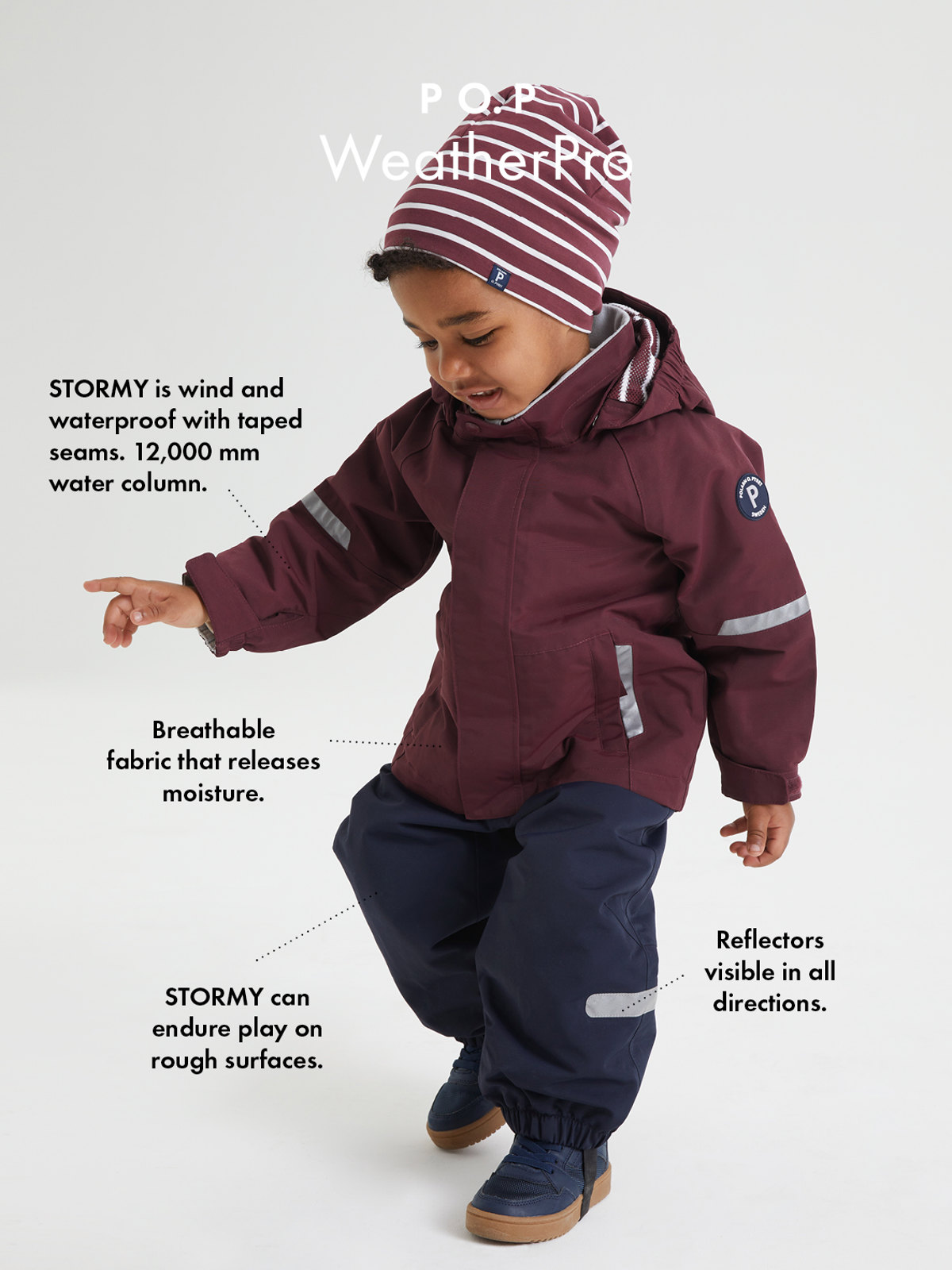 Ytterkläder märkta PO.P WeatherPro® uppfyller alla våra krav för funktionsytterplagg, oavsett om det gäller slitstyrka, vattentäthet, andningsförmåga eller barnsäkerhet.
