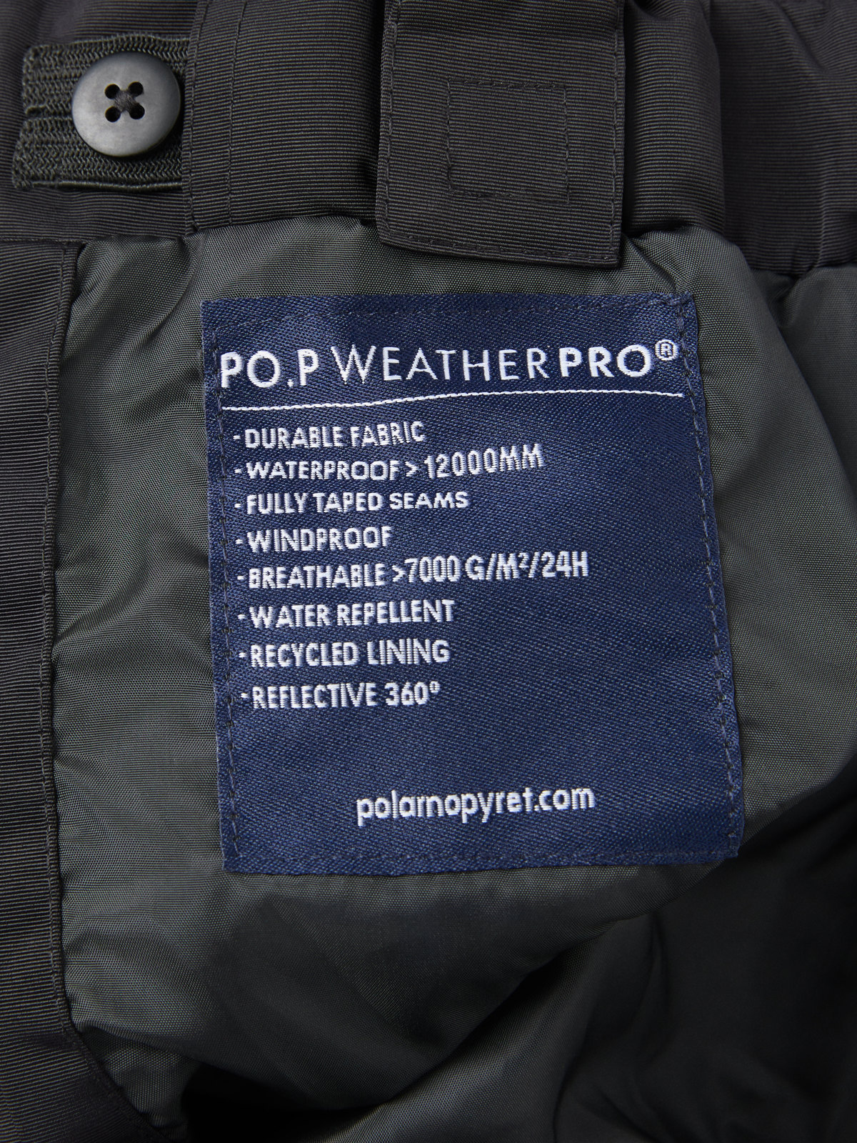 Ytterkläder märkta PO.P WeatherPro® uppfyller alla våra krav för funktionsytterplagg, oavsett om det gäller slitstyrka, vattentäthet, andningsförmåga eller barnsäkerhet.