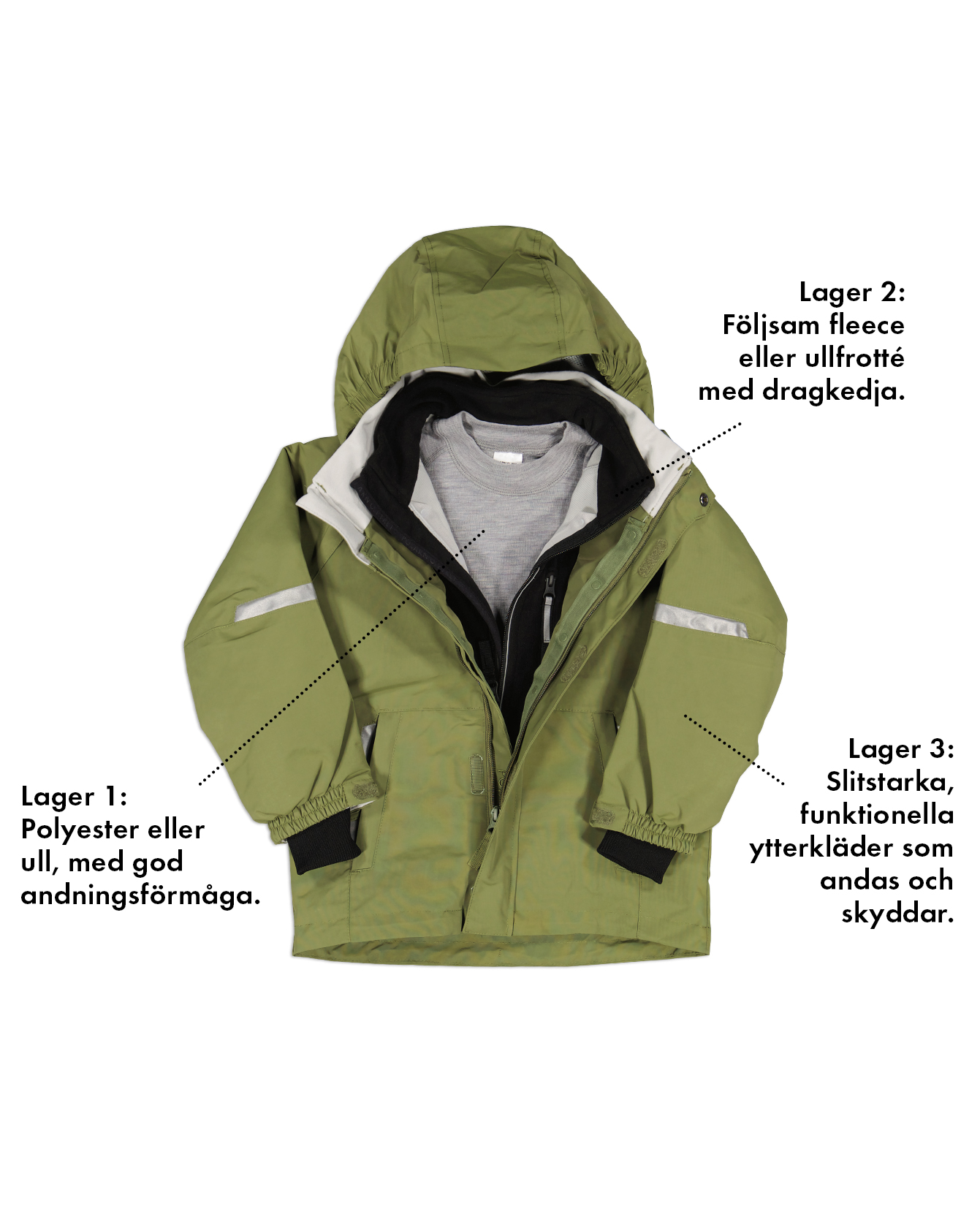 Om du klär ditt barn efter lager på lager-principen så är ni alltid väl förberedda. Barnet kommer vara varm under de kallaste vinterdagarna och också sval i vårvärmen, då barnet lätt kan öppna eller ta av något lager. Plus att kläderna kommer andas när lekarna är aktiva.